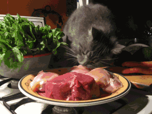 Some people are therefore returning to the basics. What did our dogs and cats eat before we had kibbles? Throughout years and years of history, dogs and cats were fed on the scraps from their humans. Scraps doesn't necessarily mean what was left on the plate after boiling, grilling, BBQing, or otherwise processing, but rather, raw meats from the game that was killed in the hunt. Being carnivores, dogs and cats do not have the digestive tract to enable them to digest grains. Lacking digestive enzymes such as amylase, dogs are unable to predigest complex carbohydrates in their mouth, taking a longer time to break down in their stomach and small intestine, if at all, thereby passing through inadequately digested and creating voluminous and smelly stools