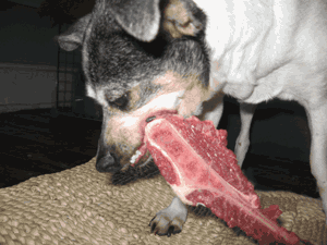 Dogs {canis familiaris}, like their wild cousin, the wolf {canis lupus}, have many similarities: a large mouth opening (to facilitate taking down and grasping large prey); the large primary muscle on the side of the head/jaw (enabling a powerful bite); short, pointed teeth (for ripping and tearing flesh plus crunching bone), teeth meeting in such as way to facilitate a cutting motion similar to shears; and showing submissive behaviours to their owners/pack leaders. This is not to say that wolves and domestic dogs are entirely identical genetically.. Commercial dog kibble companies promote their product as a 'good' source of protein, but dogs (unlike humans) have difficulty digesting proteins derived from cereals and grains. Commercial kibble does sustain our dogs, but are they healthy? Have you noticed how kibble-fed dogs and cats all eventually develop tartar build up on their teeth, some excessively so? Have you noticed how many commercial products are available for (unsuccessfully) removing tartar on the market? Did people prior to the 50s and 60s used to be required to brush their dogs' and cats teeth or take them to the vet to have tartar removed, nearly always requiring anesthetic? It's the carbohydrates in kibble that causes the plaque build up. The enzymes and acids contained in raw meat and bones help to prevent tartar build up, not to mention the natural action of ripping meat and gnawing on (uncooked) bones -- nature's toothbrush ?